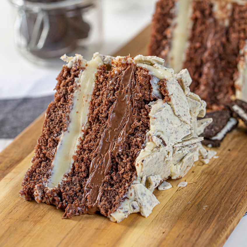 Bolo com massa de chocolate, recheio de brigadeiro de leite Ninho® e Nutella®, coberto com brigadeiro de leite Ninho® e pedaços de chocolate cookies.